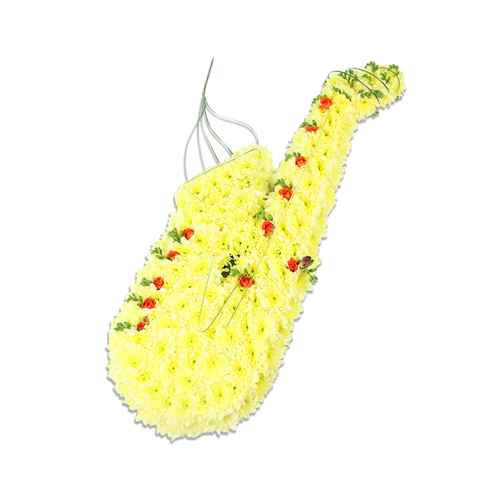 This thoughtful personalized tribute will bring along the melody of a blessed holy gospel. It is carefully arranged using the freshest yellow chrysanthemums and accent flowers including delicate spray roses.